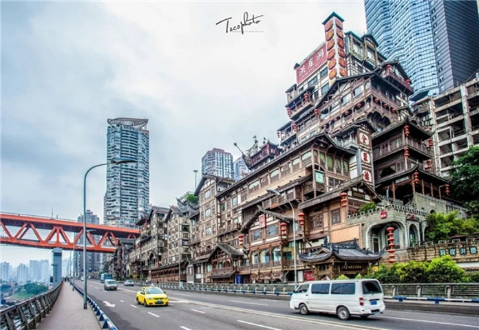 巴渝传统建筑特色的吊脚楼依山而建,置身其中,仿佛穿越到千与千寻的梦幻世界。