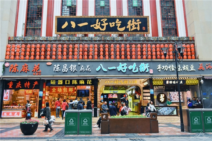 然后,步行3分钟到达八一好吃街,这是一条稳坐江湖一把手的老牌好吃街,整一条街都是各式各样的小吃,各种觅食重庆美食,重庆真的是吃货的天堂!充满着浓郁的山城特色,好吃且价格不贵。重头戏来喽!洪崖洞流光溢彩的夜景,如果你没来打过卡,那简直相当于没来过重庆。