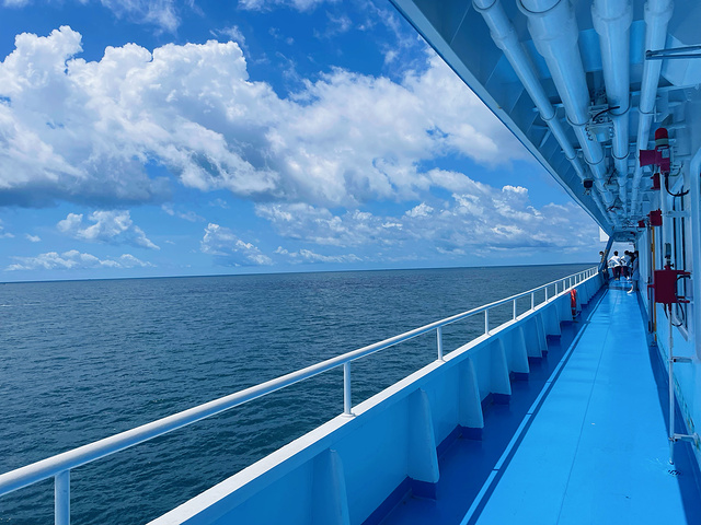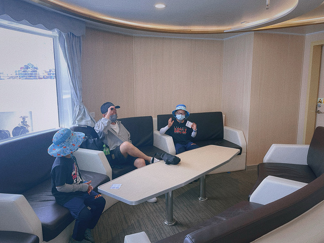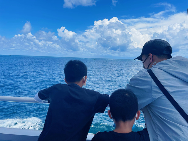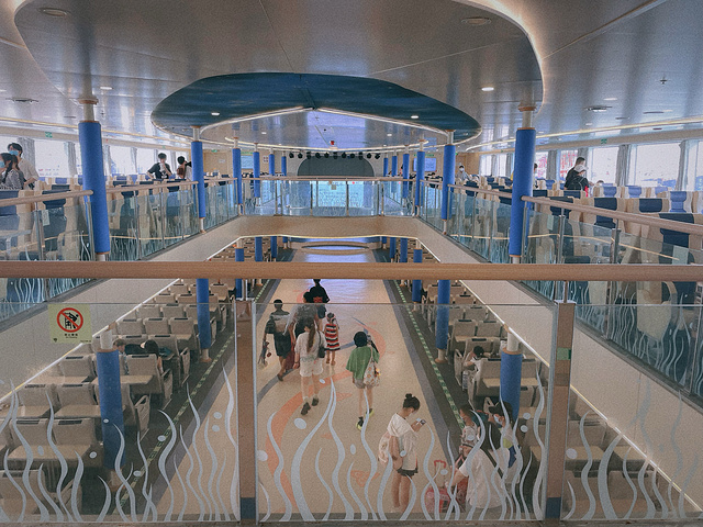 选了10:30北游25的V客舱,据说是最新的高速豪华主题游船🚢~全程1小时50分,开船后15分钟可以出去甲板拍照📸~蓝天白云大海,随便拍拍都是大片~