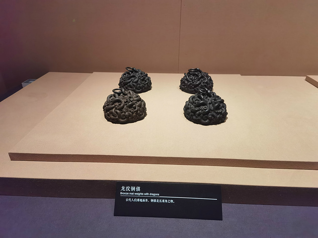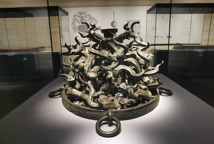 建鼓座,建鼓过去仅见于青铜纹饰和石刻画像上,本件是最早出土的实物。该座由八对大龙和数十条纠结穿绕的小龙构成,龙身镶嵌绿松石。出土时鼓布已毁。