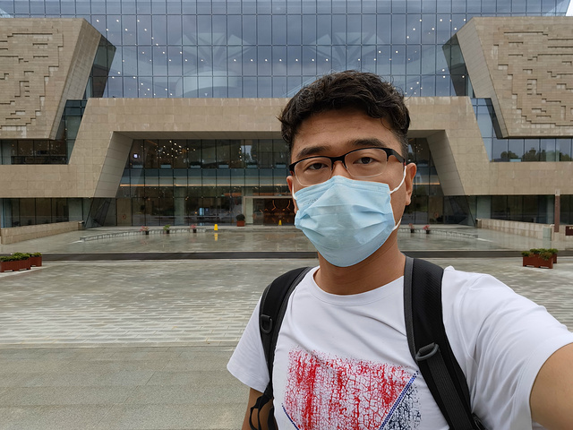 工作人员帮忙拍照,主动说,现在没其他游客,你把口罩摘了拍吧。
