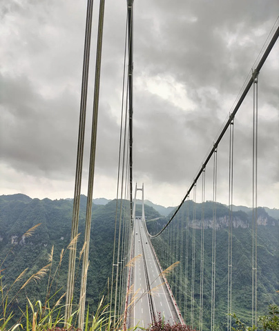 矮寨特大悬索桥(简称“矮寨大桥”)临架于峡谷之上,2007年开工,2012年3月通车,是包茂高速(G65)跨越德夯大峡谷的一座特大型桥梁。矮寨大桥为钢桁梁单跨悬索桥,主跨1176m,桥面宽度24.5m,桥面距峡谷底部高度达355m。桥梁建设中创造了“四个世界第一”,展现了人类以工程技术征服天险的魄力与勇气,被誉为桥梁建筑艺术与自然景观完美结合的典范。