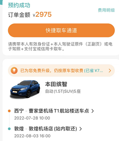 车子是提前一天就租好了 ,有些路不太好走,建议租SUV,对比了好几家租车app,最后还是选了一嗨租车,强烈推荐
