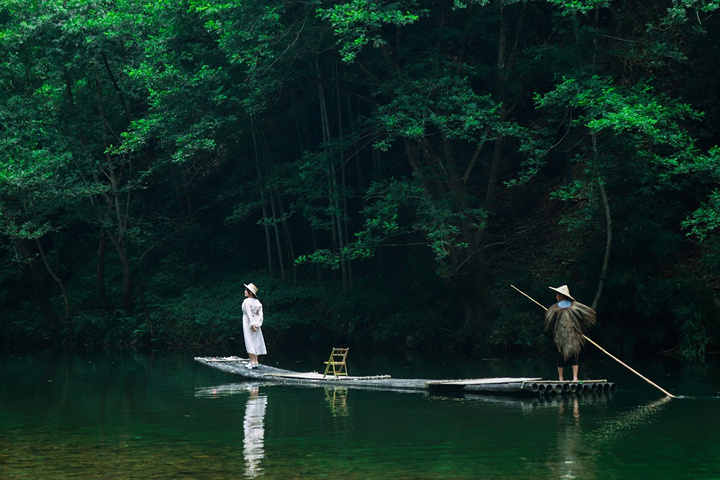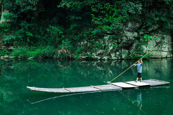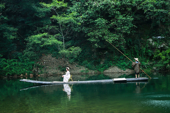 徜徉与碧波上,青山觅知音,流水应常在。坐上竹筏,长达一个小时的随水漂流,像是置身于“漓江”上,幻想自己是行走江湖的侠客,独行江上,独慕清风。