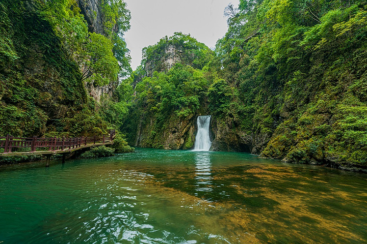 站在悬在峡谷岩壁的木栈道上,峡谷内里的风景一览无余,绿色的植被披在岩壁之上、涓涓细流在幽深的谷底缓缓流淌、峡谷上方时不时浮着几朵白云,从峡谷壁中渗透出来的小水流浸湿了栈道小径,呼吸着泥土与草的芬芳,仿佛自身与大自然融为一体。