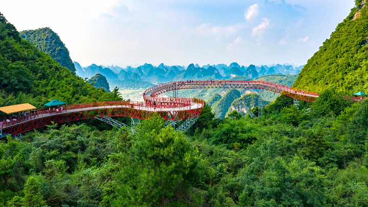 玻璃栈道沿崖壁悬空而建,长138米,宽1.8米。行走其上惊险刺激,极具挑战性。眺望远方,峰林叠翠,炊烟袅袅,田园如画。