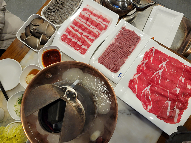 涮肉有鸳鸯锅,清水锅两种锅底。点了清水锅,万万没想到!清水锅真的只有清水T-T,清水锅也要20块,凭什么!!!官人表示不解!!!蘸碟有蒜蓉香油、麻酱两种,传统的南方人点了蒜蓉香油^^