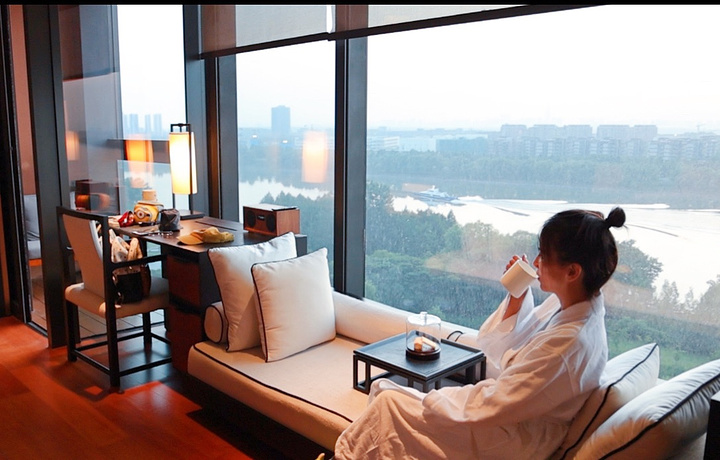👉我入住10层的江景房,视野开阔,180度全景落地窗前近在咫尺的扬子江畔绿树成荫,楼宽大草坪围绕,晚霞十分一天中最美景色,喝杯茶观日落也可以泡澡观江,露台十分惬意。