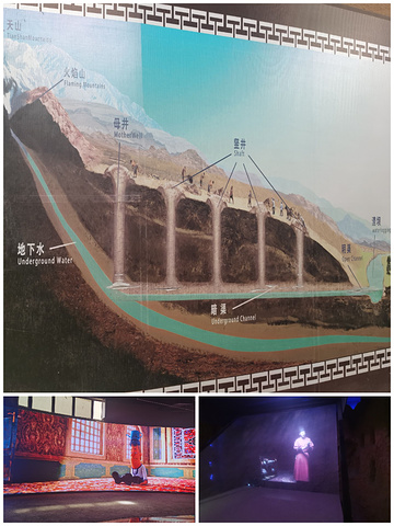 一下车酒感受到了吐鲁番的热情似火。我们人少,司机小马哥也没有安排集合时间,大家基本就一起进去逛了。第一个展厅是关于丝绸之路的介绍,交河驿站的来源,各种视频、文字、雕塑,做得还不错,很科普。出来以后是驿站旧址、马棚复原,然后是一小段葡萄架,还可以看到古井口,然后就是进入地下了。有一段四分钟左右的动画介绍,生动形象,小朋友也可以看的懂。再往下就是坎儿井的暗渠河道层了,可以让大家感受到当年的取水方式,领略古老先民的生活智慧。