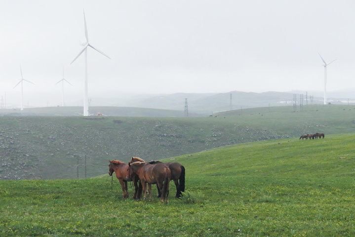 一直走到快抵达黄花沟,突然有一处雾气散去的地方,露出了马匹的身影,遂停车打卡