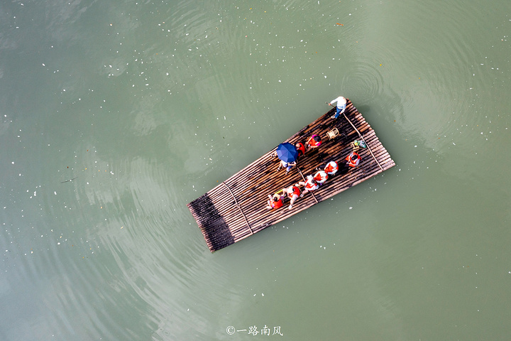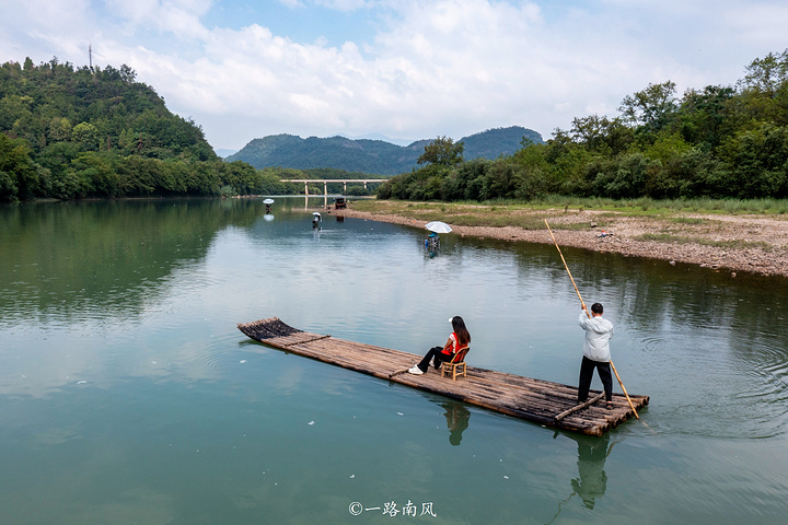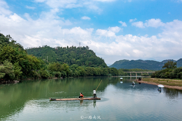 乘坐竹筏顺流而下,青山绿水美不胜收,一个个山峰、一片片竹林、一栋栋建筑映照于清波之上,让人明白什么叫“人在画中游”。