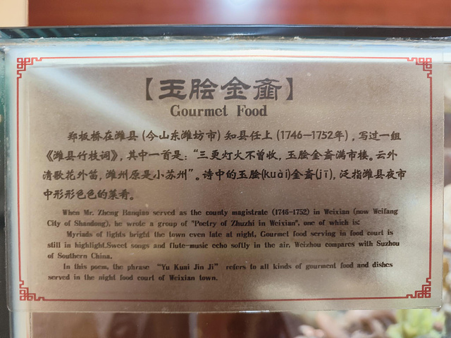 他家特色:糖醋里脊 , 芥末鸡 , 肉火烧 , 炸五香肉 , 朝天锅 , 生炒辣子鸡 , 辣烧大肠 , 老厨白菜 , 炸藕合 , 麻汁杂拌 , 海鲜毛血旺 , 炸萝卜丸子 , 拌辣皮 , 美极萝卜皮 , 潍县酥锅 , 哑巴辣椒朝天锅 , 潍坊肉火烧 , 海鲜疙瘩汤 , 肥肠 , 椒麻小牛肉 , 潍坊芥末鸡