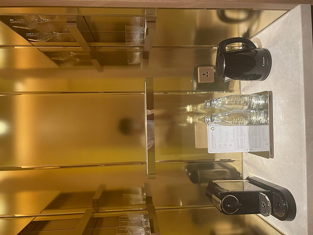 水有很多瓶,免费,免费的就是好喝的,抽屉里面还有很多咖啡机的胶囊,也是免费的。