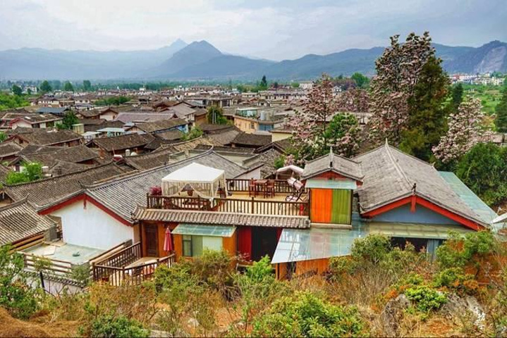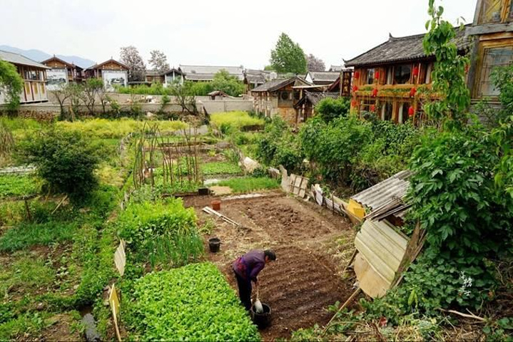束河的民居建筑布局几乎都是依山面水。在山上我们可以看到大片的田地,在束河流行着一句笼络人心的话:“一不留神就走到菜地里了”,可见束河是充满了恬然与闲适的地方。