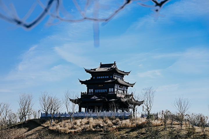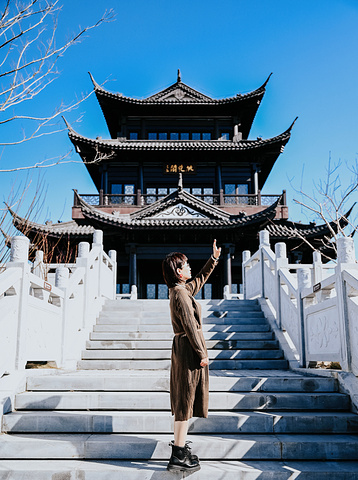 进门第一眼就可以看到景区的地标--巍峨耸立的桃花阁和寿星公。桃花阁巍峨耸立在景区内,在景区任何地方都能看到,也是打卡拍照的最佳机位,登高可以远眺整个景区。与前方的草地、湖面、木栈道、寿星公融为一体,构成一道美丽的画面。