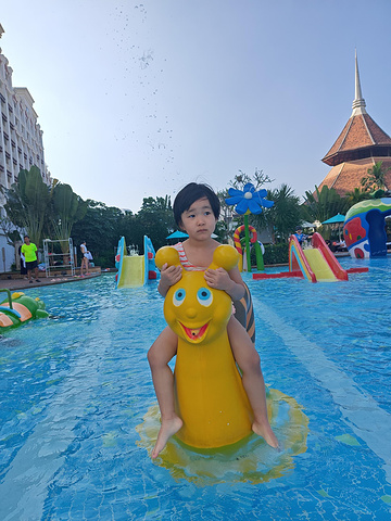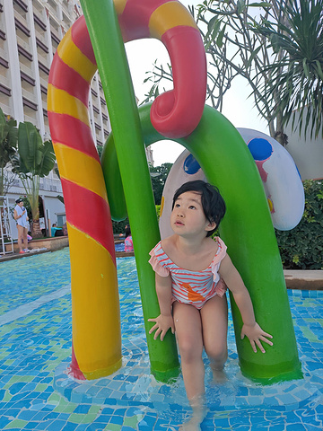 中午在酒店门口的曼飞龙烤鸡买了一份午餐回去吃。吃完小孩还不困,一直折腾,我们就去了酒店五层顶楼的游泳池。