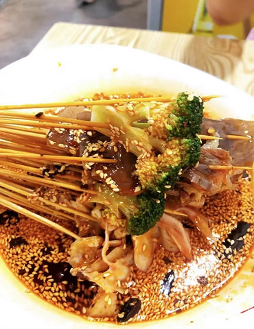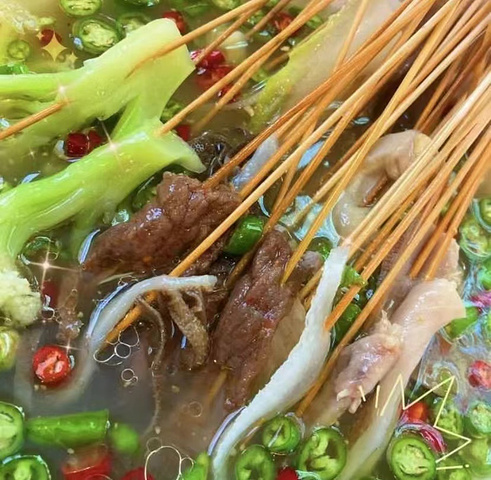 菜品:大家可以在玻璃橱柜只 里选好喜欢的菜品,这些菜品都是当天备好的新鲜熟制品,直接浸入到相应口味的汤底里。浸泡几分钟就好了。这样可以极大程度的保证食物在淋上汤汁后最原始的味道,每次都是现打的汤底,鲜鸡汤打底,淋上秘制的辣椒油,撒上芝麻和青红椒圈,一份鲜香麻辣的汤底就出炉啦!