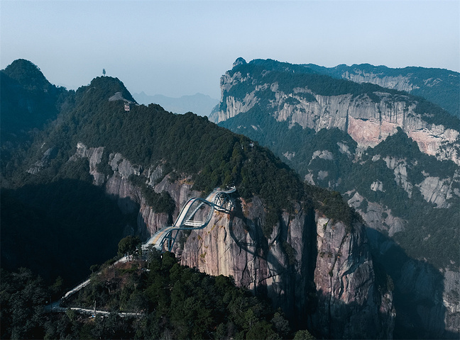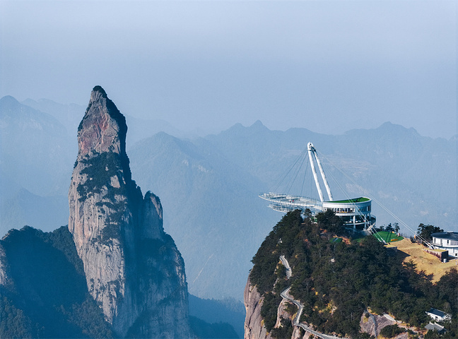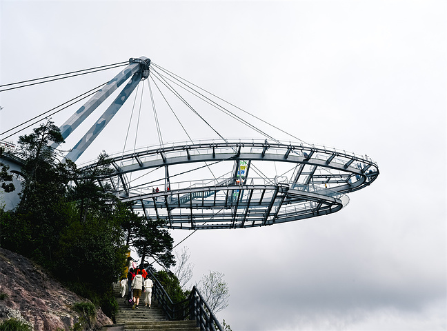 南天顶:悬空架在悬崖峭壁上的飞船形状的巨型观景台,悬挑45米。都是透明玻璃设计,非常刺激。二层有少许非透明玻璃,想挑战自己极限的可以卡边走,真是无比刺激的挑战。