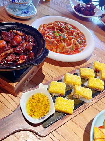 之前一搜古城美食,这家店真真挺火,周内工作日是淡季,中午大概十二点多到店的没有排队,不过店里吃饭的人也挺多,可能是我们运气好嘻嘻,他家上菜速度挺快!刚扫完码也5分钟吧就开始上菜了!,我们点了招牌老陈醋焖牛肉、黄米凉糕、香醋鸡蛋和八宝栲栳栳,量是真的大,味道也是真香,环境和服务也很加分,菜品也没有踩雷