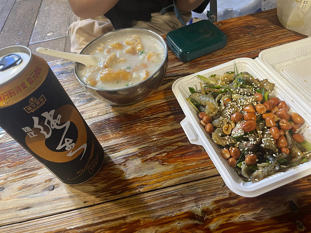 晚餐一份鱼皮,一份艇仔粥,再来上一罐珠江啤酒。
