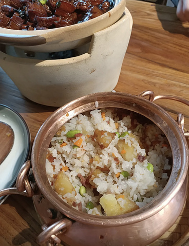 点招牌小锅饭,点椰香泡鲁达白,点了普洱茶红烧肉,点了包浆豆腐,小锅饭是招牌,两个人点了小份做主食,像各种佐料的炒饭,味道不错,红烧肉好吃,肥瘦适中,量不小,两个人吃着刚好,不会很咸,口味把控比较好,泡鲁达个人觉得这里比芒市更好喝,其他地方没喝过,不予以比较和评价!包浆豆腐,这个好吃,豆腐外焦里嫩,拌着外面的佐料吃,味道会更加好!