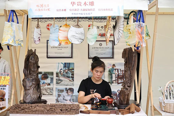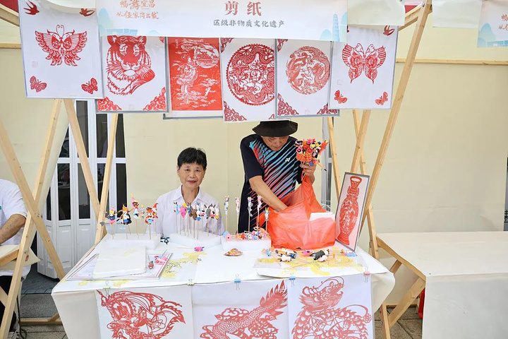 现场还设置了丰富多彩的非遗集市,剪纸、棕编、糖人等传统手工艺品吸引大批市民驻足,“畅游宜昌 从伍家岗出发”“天然塔”“游船”“兔子”等具有伍家文旅元素的展品成为热门拍照打卡点。趣味锤丸、玉兔钓萝卜、投壶以乐等花样游玩项目也让人们兴味盎然。市民们零距离感受到伍家岗在传统文化与现代时尚元素融合中所挖掘的文旅产品。