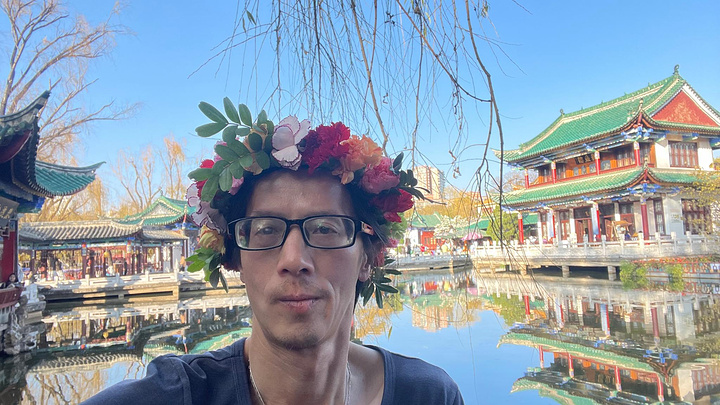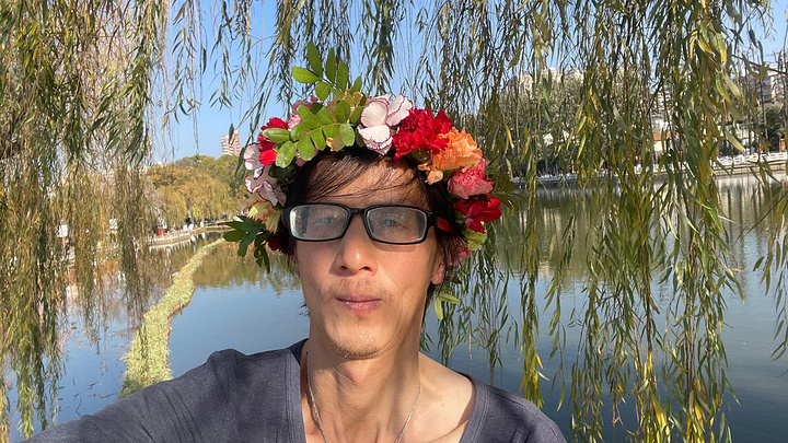 夕阳西下,余光散射,树影绰约,一轮红日躲藏影中悬挂空中,湖水由浅色变金色,金色笼罩翠湖。树梢,路旁,小草,房屋,湖面,椅凳,莲荷覆盖光环。湖边大道小路全是人,湖莲绿萍柳树飞鸟斜阳映照翠湖之美。起名也模仿什么湖,有意思。从湖中道进入主道,市场经济开始了,什么泥人,洱块,小吃等我所熟悉。又购洱块, 不同口味,真的没有第一次吃得舒服,惊奇,因为第一次永远是最好的。人就是这样奇怪,这也是人与动物思想情感区别所在,倒的手工泥人工艺吸引我又购买之。翠湖的美无法用语言表达,而是用心灵体会。到处景致盎然绿意浓浓花枝招展绿满人间。亭台楼阁飞檐画栋小桥流水池塘游鱼观景赏鱼品茶君临倚塘看书消遣喝茶打牌逗乐,处处布满真情直感笑脸笑容笑场翠湖人间。 不想离开趁着夜幕湖光点亮,树影斑驳彩光闪烁灯绿相配古树苍天建筑和谐繁星点点人声鼎沸之时祥云离开。