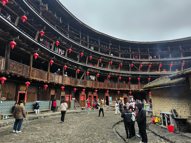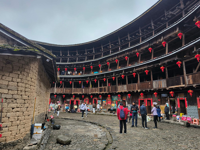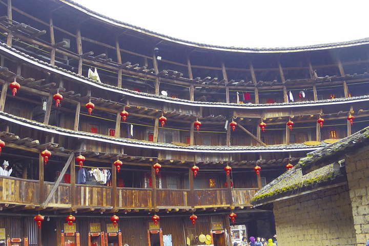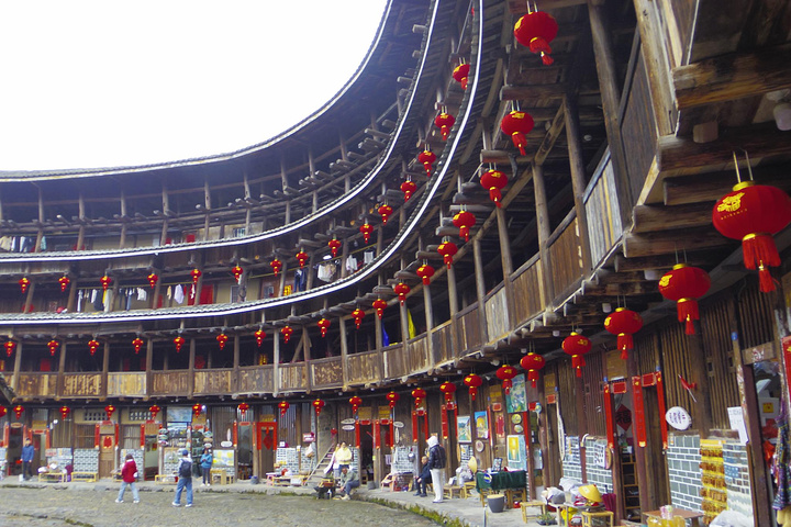 我再次慕名而来。没错,与书上的一样——一样的奇特,一样的壮观,一样的沦桑;一样斑驳的土墙,布满裂缝;一样的木板走廊,颤颤巍巍。青石板路,土坯小房,土楼仍旧保留着当年的建筑风味。惟一和我所想不同的是,土楼现在还有人居住——同一宗族的村民,世代居住在同一座楼里,繁衍生息。