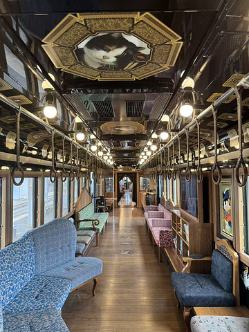 小玉列车和博物馆号列车全车装潢极其考究,无论是车身、窗贴、沙发座椅、拉环,照片墙,还是书架、展示柜,都体现了长足的用心。博物馆号上还有扭蛋机,300日元可以得到一枚徽章的纪念。贵志站的二代玉有点懈怠,睡觉怕是她的常态,猫造型的车站一定要打个卡。