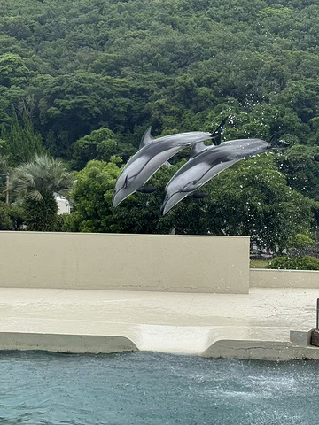 13:40靠岸,上岸就能看到不远处馆体外墙绘着大鲸鱼的博物馆。门票1800日元, 用折扣券抵扣了100块,能省就省。进门是纪念品销售区,后方是博物馆的展示区。我在售卖区前直接从左后侧进入户外表演区域,博物馆区直接跳过了。13:30开始的海豚表演正进入高潮阶段,表演结束后,是可以付费300日元抚摸海豚并且合影的,可惜当时不知道。海豚区设计成花瓣状,三个水池相连,中间是表演平台,正对水池是半环状阶梯的观众席。下午海豚的另一场表演是15:30开始。
