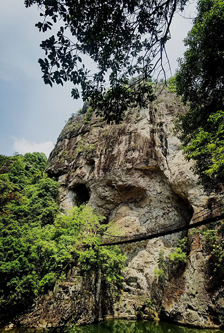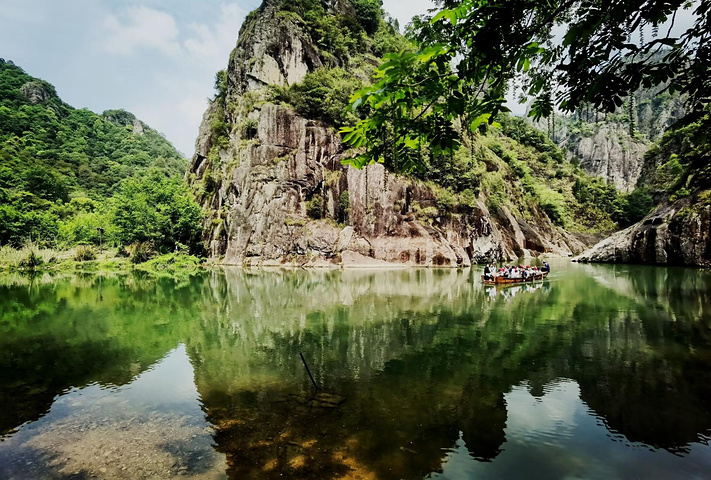 2、渡船码头→对岸的渡船码头。这段区域是整个景区的精华区域,这里有个清澈的酒缸潭,两岸峭壁高耸,群峰倒映水中,岩洞怪石、密林溪水,很容易让人浮想联翩,从东门到西门,或从西门到东门,都要在儿摆渡,才能到达对岸,坐一叶小舟,看群山叠翠、怪石峥嵘,听船浆划过水面的声响,满满的诗韵画境。这小船挺有意思的,船舱中座位不是排排坐的那种,座位是分列在船舷的两旁,座的时候不能一边座,要两边均等,否则会侧翻的!这个摆渡只不过五、六分钟时间,上了船后主打一个:船上听故事、转头看山势,船老大背书般的导游词说了一通,你头转过去还没转回来,船已靠码头了,这个坐船的时间也忒短了!为什么船行路线不能设计的长一点,可以这儿转一转、那儿游一游,让人们在山水画廊里多畅游一番呢?
