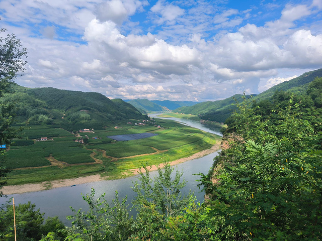 眼前的景象,瞬间将我所有的想象都比了下去。浑江在这里完成了一个近乎360度的大转弯,好似被一双无形的大手轻轻挽了个结。江水清澈碧绿,在阳光的照耀下波光粼粼,宛如流动的翡翠。环绕着大转弯的,是连绵起伏的青山,山上植被茂密,层层叠叠的绿意与湛蓝的天空相映成趣。