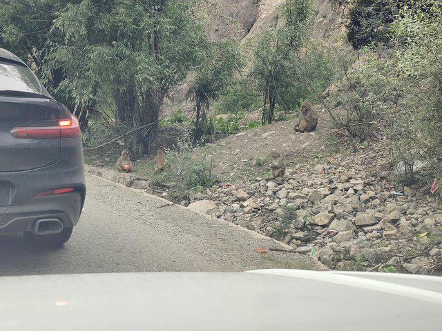 当你路遇野猴,想停下玩耍,先看看是否有合适的停车处,我路上遇到堵车,走了半天才发现,原来是路边一群猴子,前面的车,有人停下喂猴,后面就堵了。