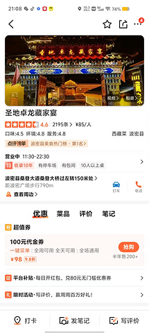 装修很不错,但85人均,菜非常一般。咋说呢,酥油茶就是咸奶茶,确实香,确实也喝不惯!剩下牛肉羊肉的,跟别地儿甚至跟河北,区别不大!价格倒是对得起装修。建议非大城市高消费人群,慎重吧~