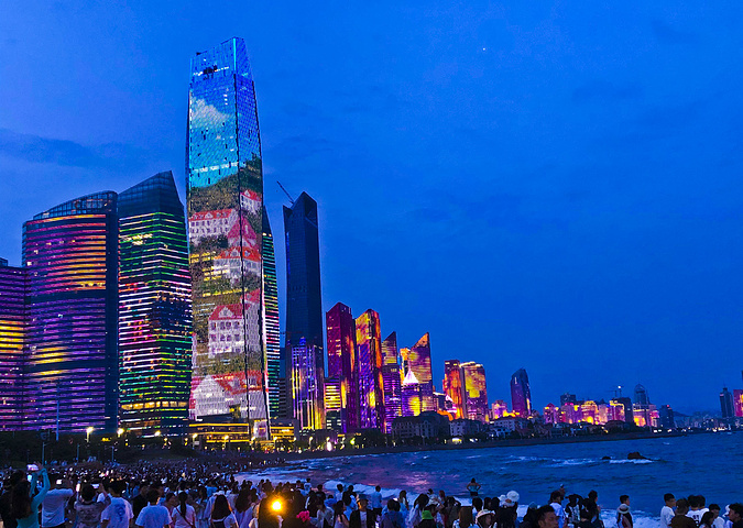 观察了这里的情况,感觉观赏灯光秀最佳地点就是第三海水浴场,但要往南走,浴场最南端的位置、角度、距离最佳,不向南走位置比较斜。海信广场天台和帆船中心距离太远了,并没有这里好。