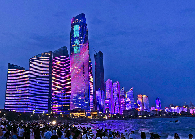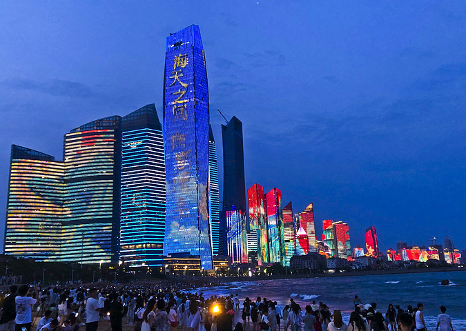 5:00闭馆,下班时间很堵车,接受昨天的教训,今天决定不回酒店了,休息会儿直接去第三海水浴场拍摄灯光秀,没拍到蓝调画面就是不甘心。 在海洋世界院子里找了一个地方休息吃东西,快6:00出发去第三海水浴场,距离不远6:30就到了,没有坐的地方,大家都坐在沙滩上,我也找了个地方坐下。7:00就有的大楼开始亮灯了。7:20进入最美时段,蓝调天幕下高低错落的大楼,变幻着各种艳丽色彩与图案,美仑美奂极为靓眼。
