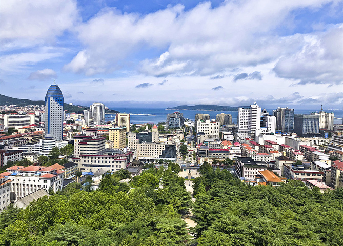 电梯上的顶楼,哇!景色不错呀,蓝天上大朵的白云,远处大海湛蓝清澈,在青岛几天看到的海都没今天威海的美。上台阶时还心中不快,感觉是不是不应该来呢,可这一刻就觉得值得。旅行的意外之喜。