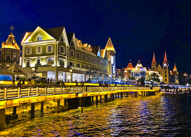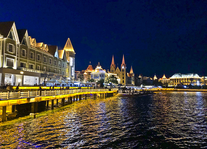 继续乘17路公交到渔人码头。先在里面走了走,环境不错,4A级旅游景区,三面环海。项目集合了旅游、餐饮、休闲、娱乐、购物、度假等多种元素。但我没有深入游览,走一下就到南岸的亲水码头附近喝着饮料闲坐。游人不少,吃东西的地方也多。可等到7:30没有开灯的意思,今天来此的目的就是欣赏这一片洋房灯光。后来在一个亭子里边听路人弹琵琶边等,眼睁睁等过了蓝调天空,8:00天空完全黑了后才亮灯,太可惜了。