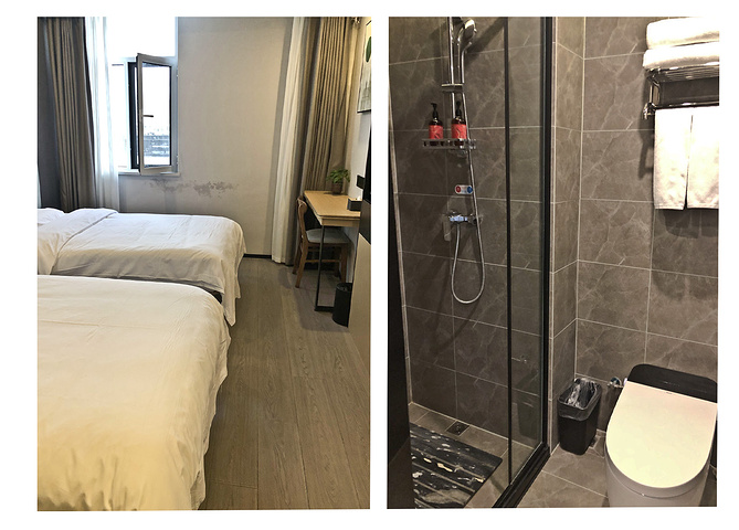 订了一个码头附近的新酒店,才100出头的价格,大床间面积不小,卫浴间也不小,还是自动马桶。就是干湿半分离,有地巾,洗时得小心些。总之是个物美价廉的酒店。