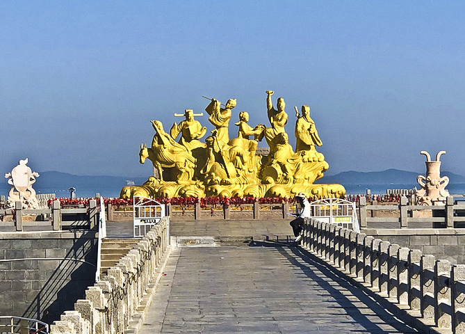 早起吃个方便面,7:30打车去八仙景区,八仙过海景区三面环海,形如宝葫芦横卧在大海之上。主要景观有仙人桥、仙源楼、会仙阁、颐心亭、龙王宫、八仙过海处、观海长廊等。新建筑加上古老的神话传说,迷人的山海风光,也是游客来蓬莱必游的景点之一。景区不大,早上人少,不到一小时我就看完了。