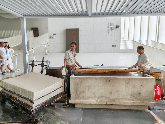 我们还看到了宣纸的制作工艺流程展示,从原料的选取到最后的成纸,每一道工序都凝聚着工匠们的智慧和汗水。此外馆内还有工作人员现场展示制作工艺,他们有的在浸泡原料,有的在捶打纸浆,有的在晾晒纸张等等。