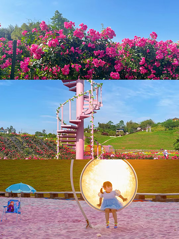 第二天去了百万玫瑰园,这里又是另一个世界。玫瑰顺着竹篱爬成花墙,月季在草坪上织成花毯,连空气都成了甜的。我们租了辆双人自行车,沿着花径慢慢骑,风拂过脸颊,带着花瓣的轻香。园子里的小火车“呜呜”驶过,载着一串孩子的笑声,惊飞了枝头的麻雀。