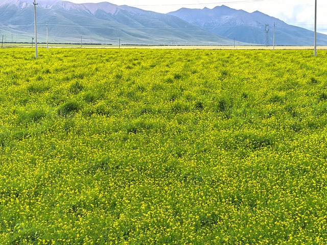 车行至祁连山中段的扁都口,抬眼望去,漫山遍野的油菜花肆意铺展,金黄一片。相较于后续游览的门源油菜花,这里的花海倒是更值得一看。