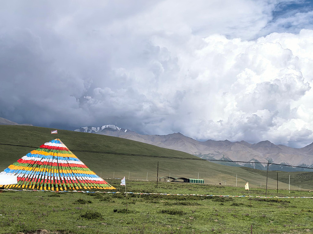 路过岗什卡雪峰,此时云层很厚,远远的只能看到一点点雪山尖尖,给人一种神秘而圣洁的感觉。