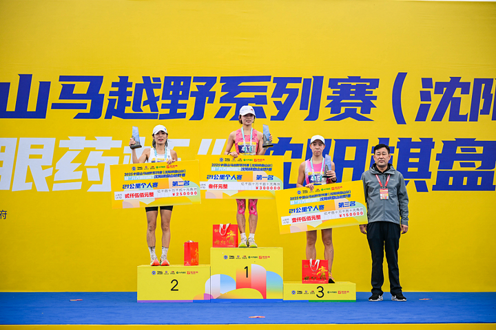 沈阳兴齐眼药股份有限公司总经理高峨为42公里个人赛女子组前三名颁奖