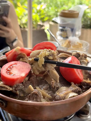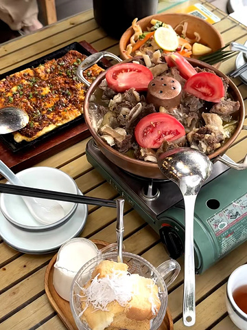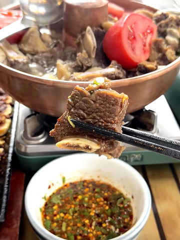 香格里拉牦牛肉小火锅:牛肉都是熟的锅子烧开就可以吃了牛肉有些带筋 嚼起来有嚼劲 肉的部分还是比较嫩的底下铺了包菜整个锅子吃起来挺清甜的单吃牛肉会比较清淡餐厅会给酱料 沾了吃还是蛮香的