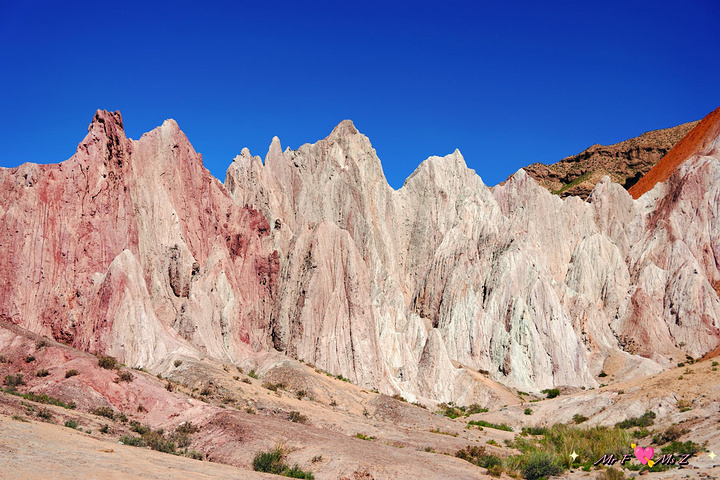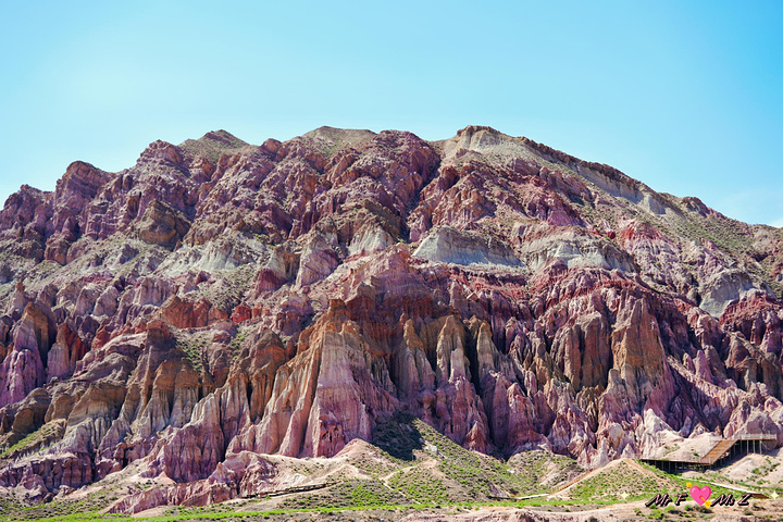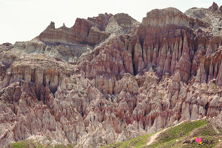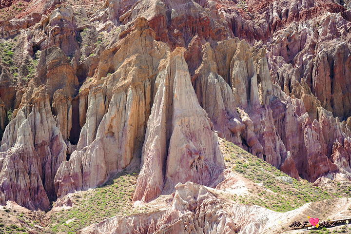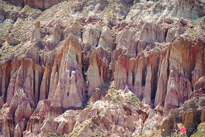 最先迎接我们的“五彩迎宾山”犹如天神打翻的调色盘,赤、橙、黄、紫、白等多色泥乳质砂砾岩构成的山体,在平地上突兀而起,成峰峦叠嶂之势。
