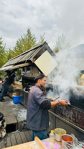 从观景台下来,过了禾木桥,就是老村,十分热闹。吃了馕和羊肉串,都非常香。这家店本地人也在排队买。