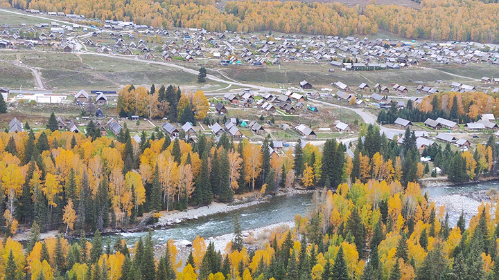 站在这里可以俯瞰整个禾木村,是欣赏日出和晨雾的好地方。禾木河流淌其间,摄影者喜欢拍的晨曦和炊烟,这儿都有。
