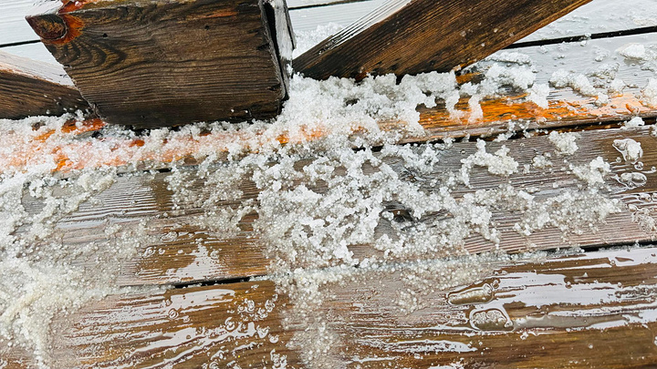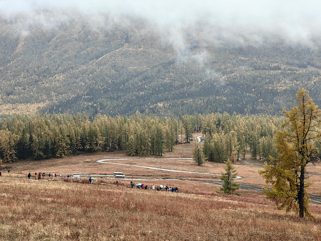 到达喀纳斯服务中心,被告知观鱼台封闭着。先吃中饭吧,吃到一半,两点十几分,听说观鱼台开放了,马上放下筷子出发,生怕等一下又封闭。排队上区间车,排队攀登观鱼台。天气从阳光和煦,变为小雨,再变为冰粒子与狂风大作。几分钟时间,冰粒子已经堆积了。